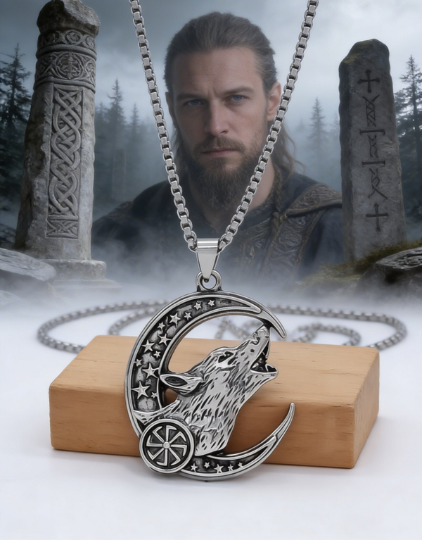 Der heulende Wolf im Halbmond steht für Instinkt, Nachtkraft und innere Freiheit. Sterne und Rad-Symbol verleihen dem Design eine archaische, nordische Tiefe.