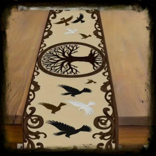 Dekorativer Tischläufer mit Lebensbaum und fliegenden Raben im nordisch-keltischen Stil. Pflegeleicht, vielseitig einsetzbar und ideal für Küche, Tischdeko und besondere Anlässe.